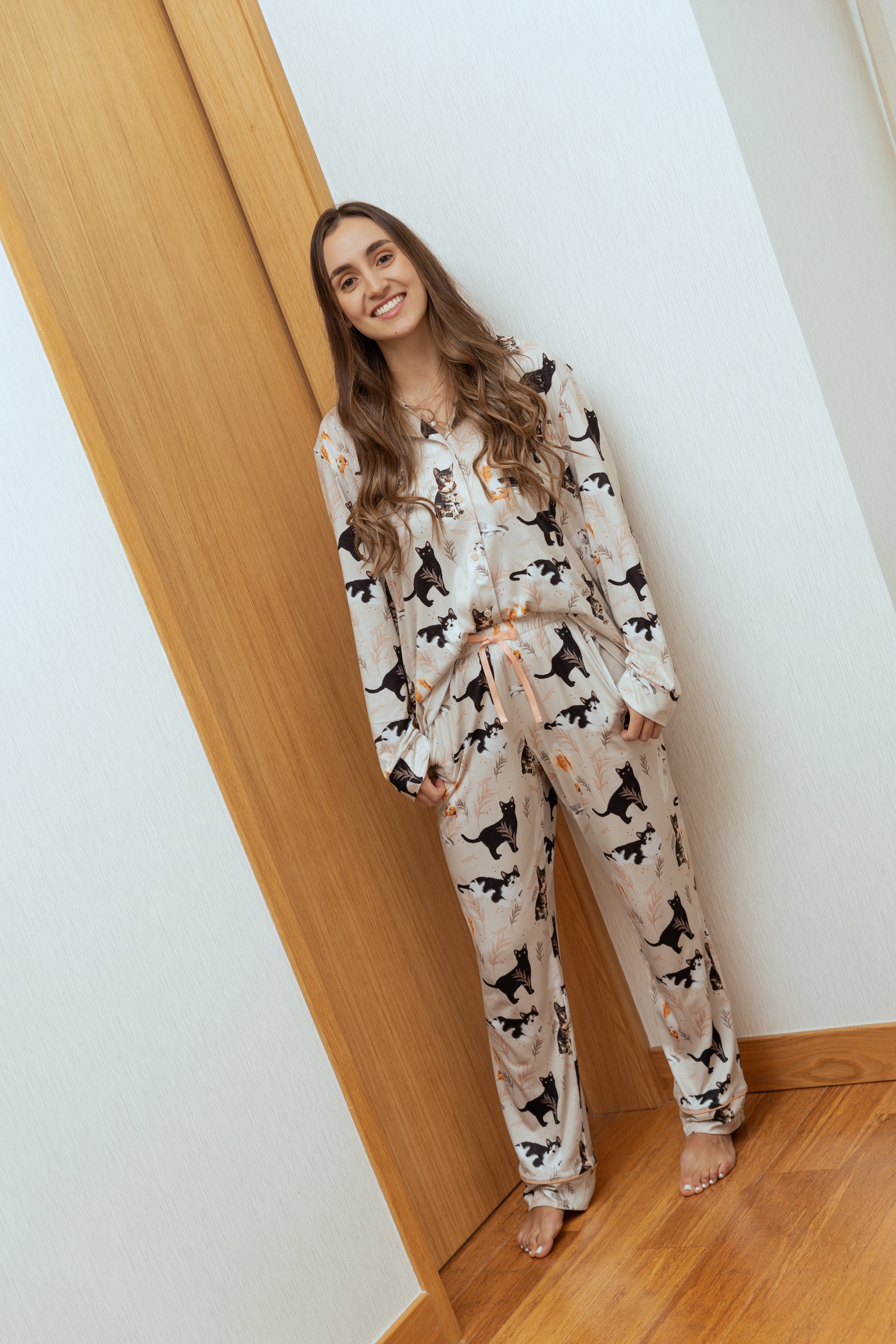 Damenpyjama mit langer Hose und kurzärmligem Hemd mitKnöpfen. Beide Teile sind mit handgezeichneten Illustrationen verschiedener Katzenrassen bedruckt: Bombay, Smokin, Khao Manee, Getigerte und Orange Katze.