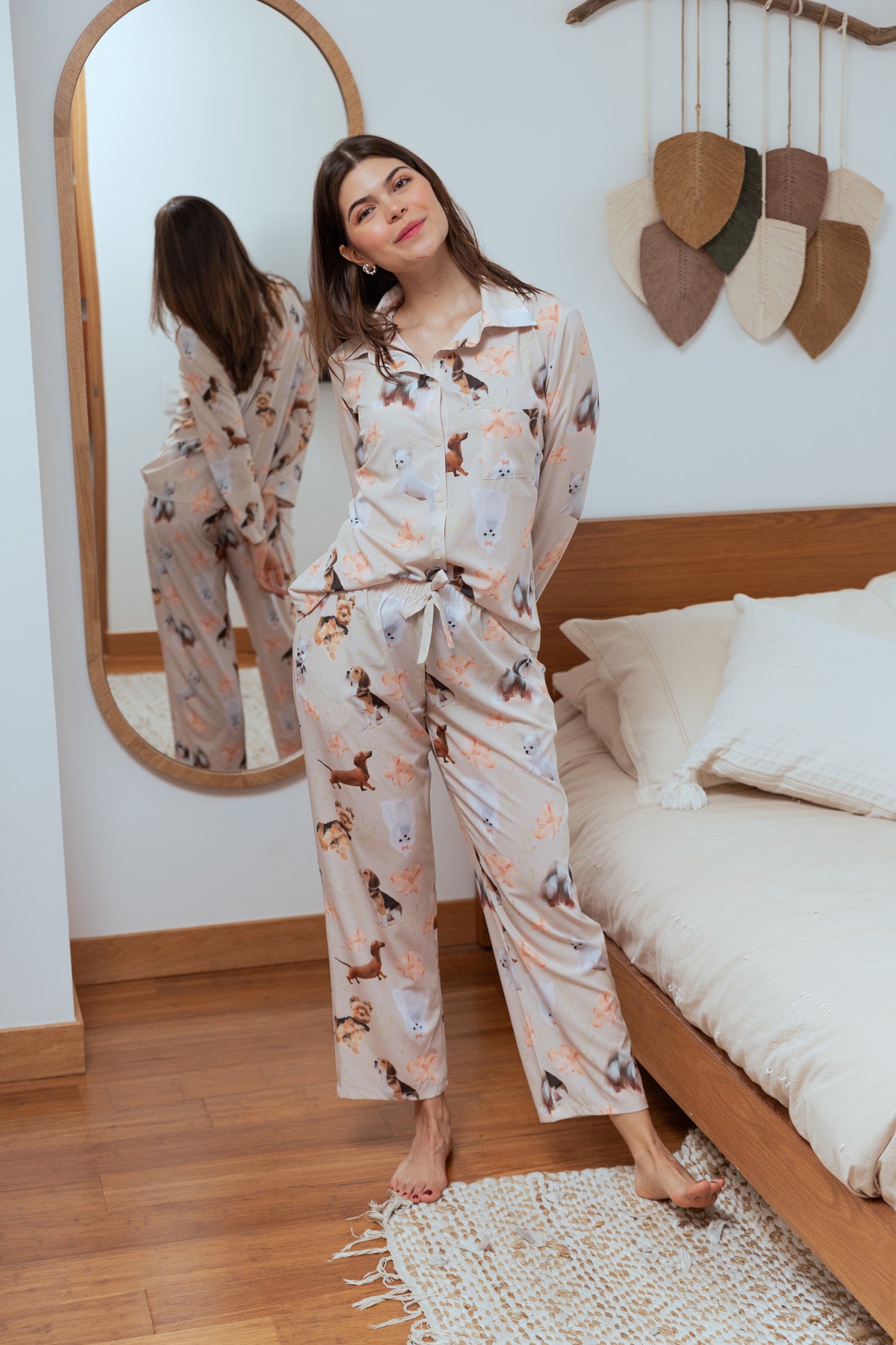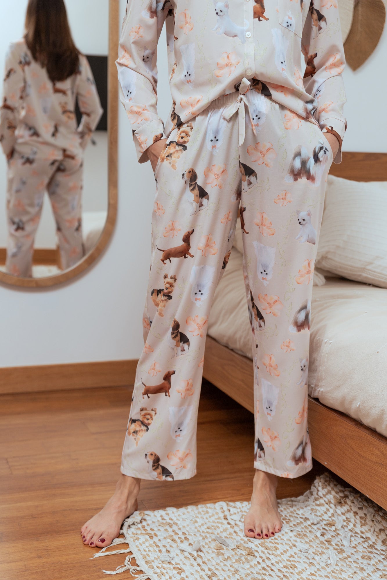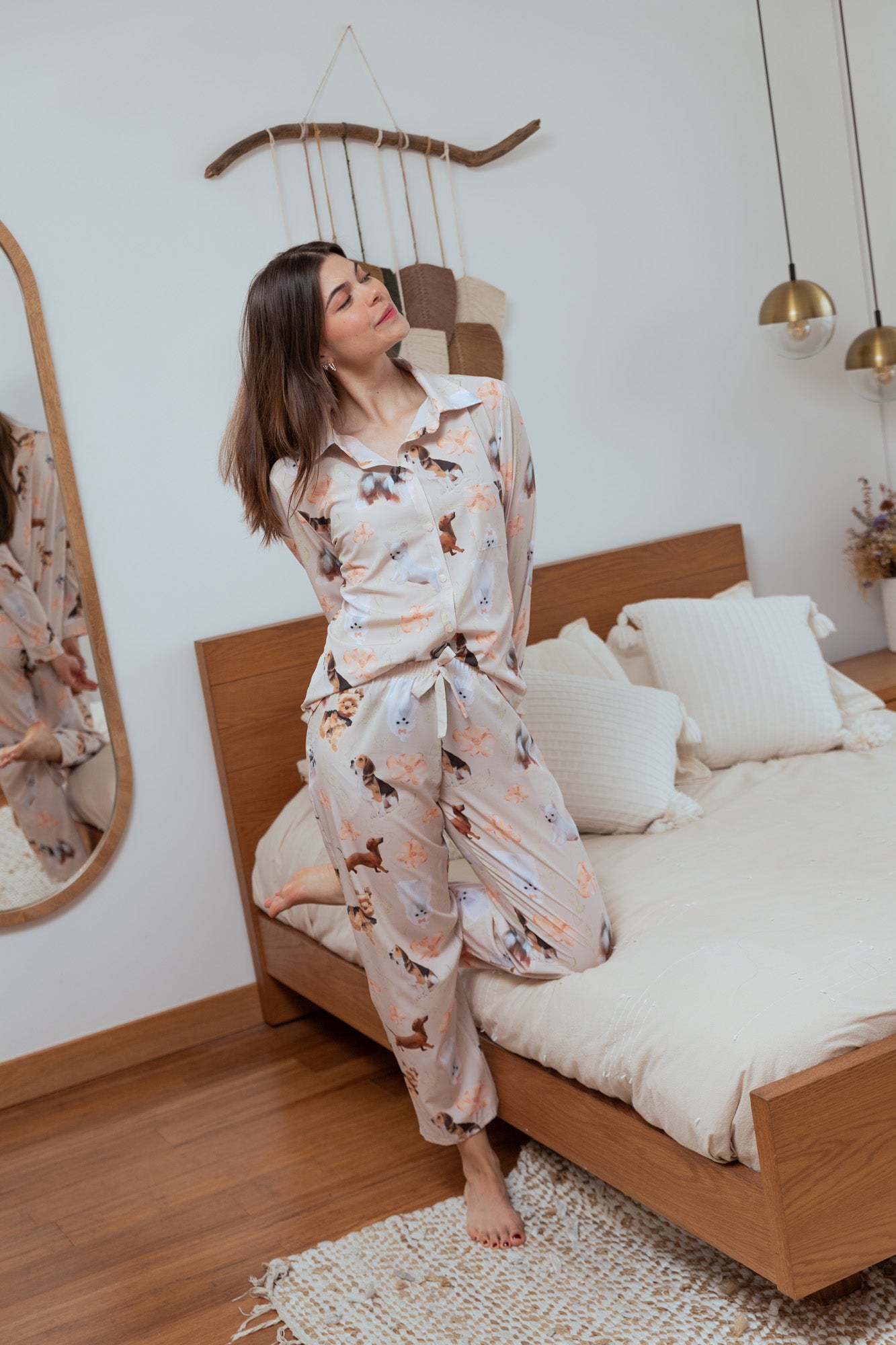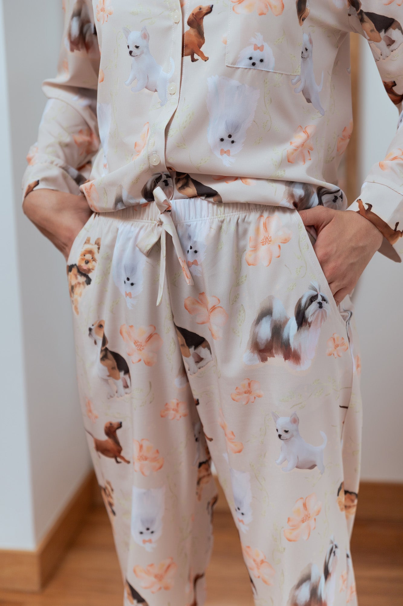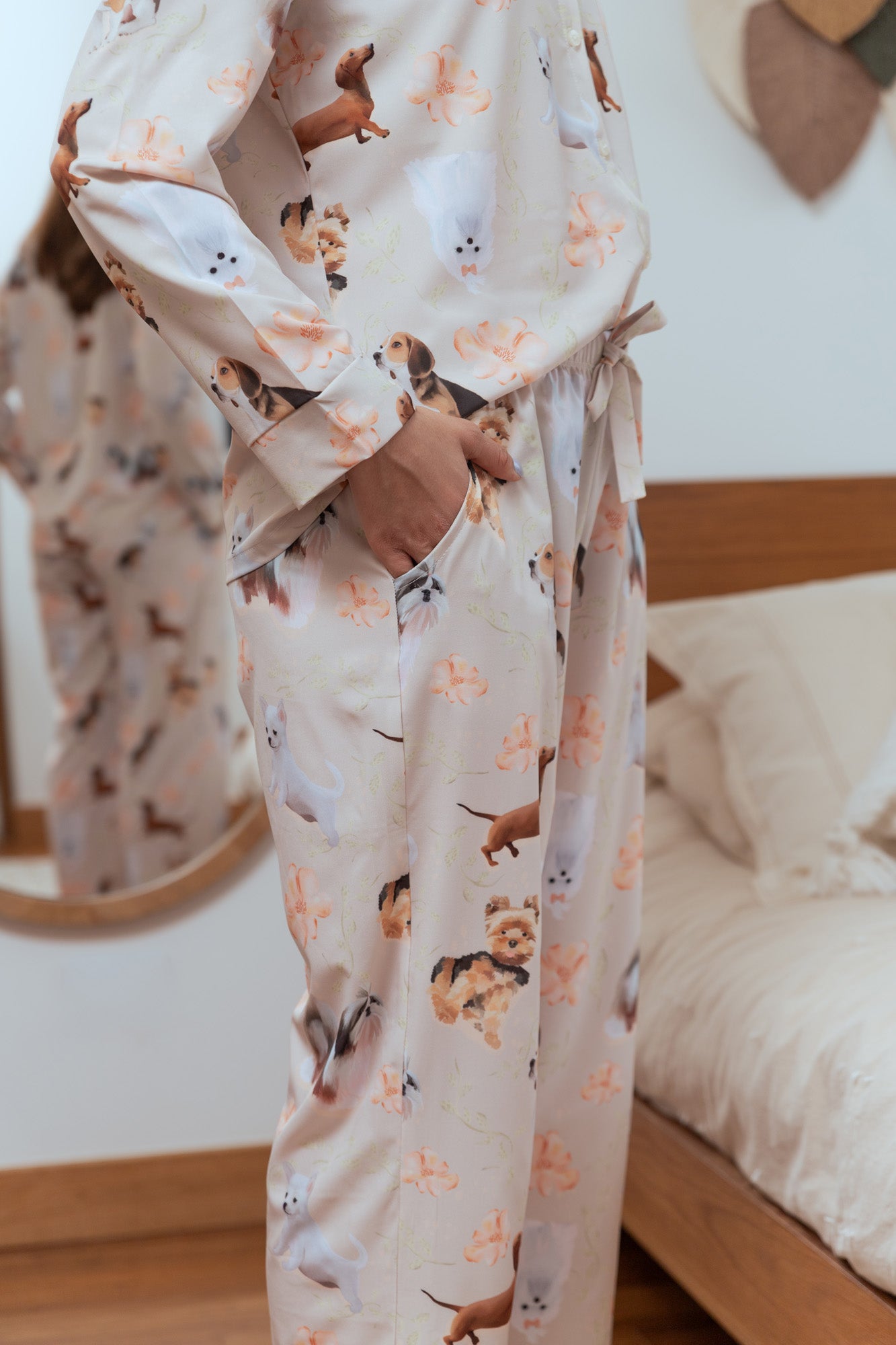 Damenpyjama mit Hose und langärmligem Hemd mit Knöpfen. Beide Teile sind mit handgezeichneten Illustrationen von kleinen Hunderassen bedruckt, darunter: Yorkie, Shih-Tzu, Beagle, Dachshund und Chihuahua.