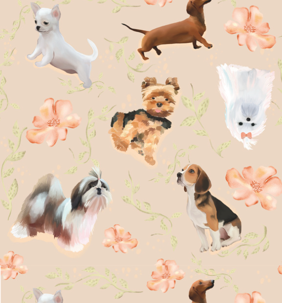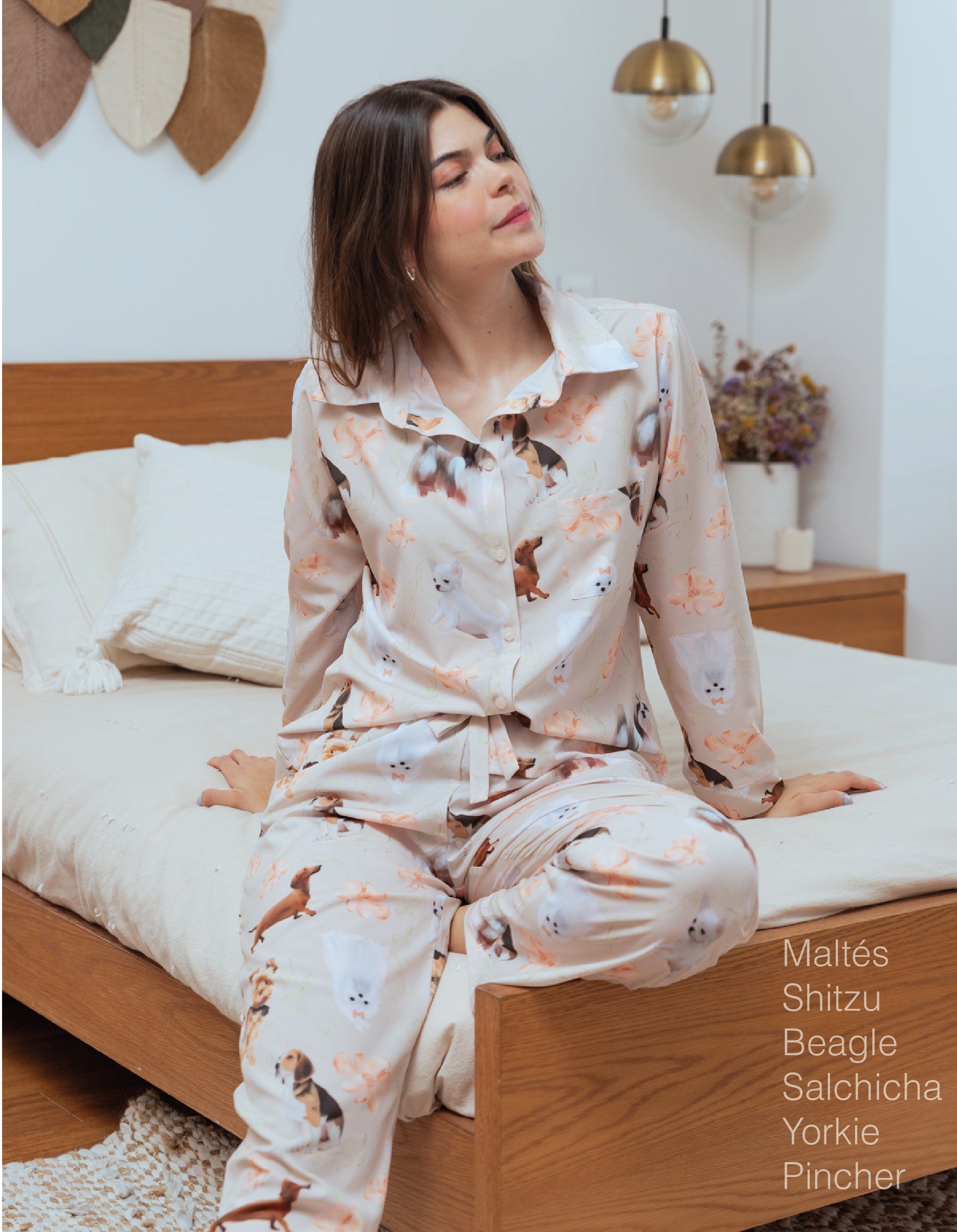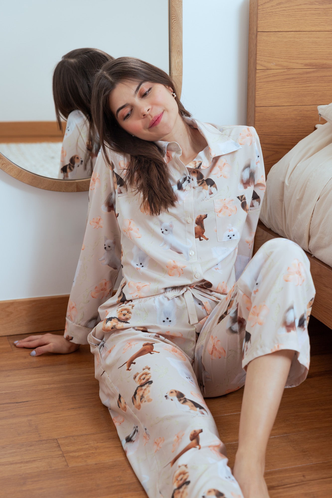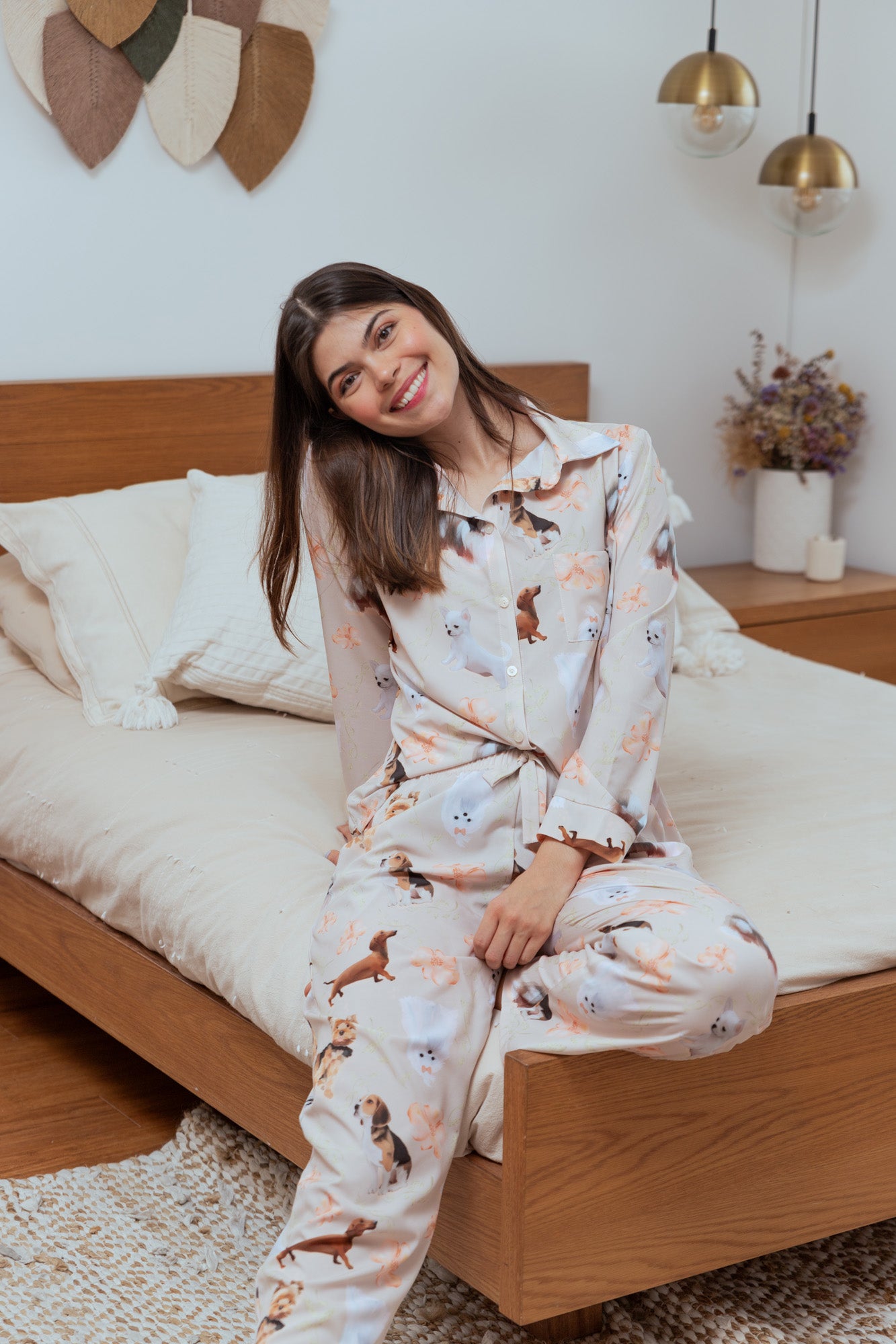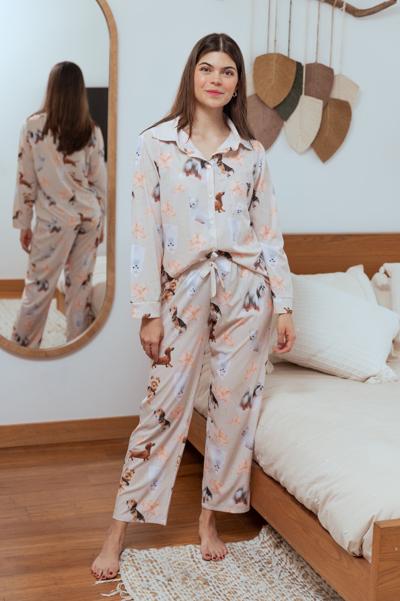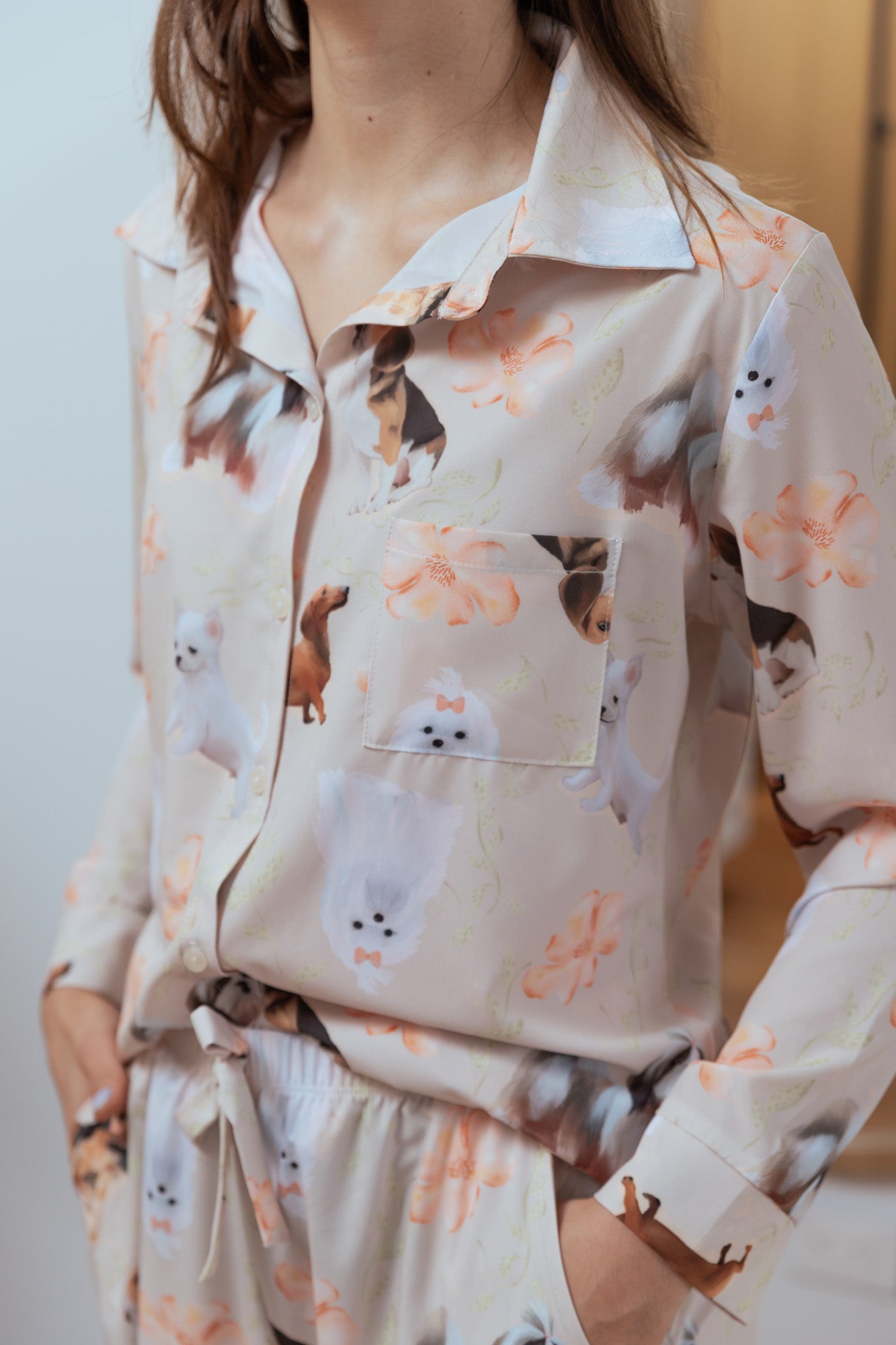 Damenpyjama mit Hose und langärmligem Hemd mit Knöpfen. Beide Teile sind mit handgezeichneten Illustrationen von kleinen Hunderassen bedruckt, darunter: Yorkie, Shih-Tzu, Beagle, Dachshund und Chihuahua.