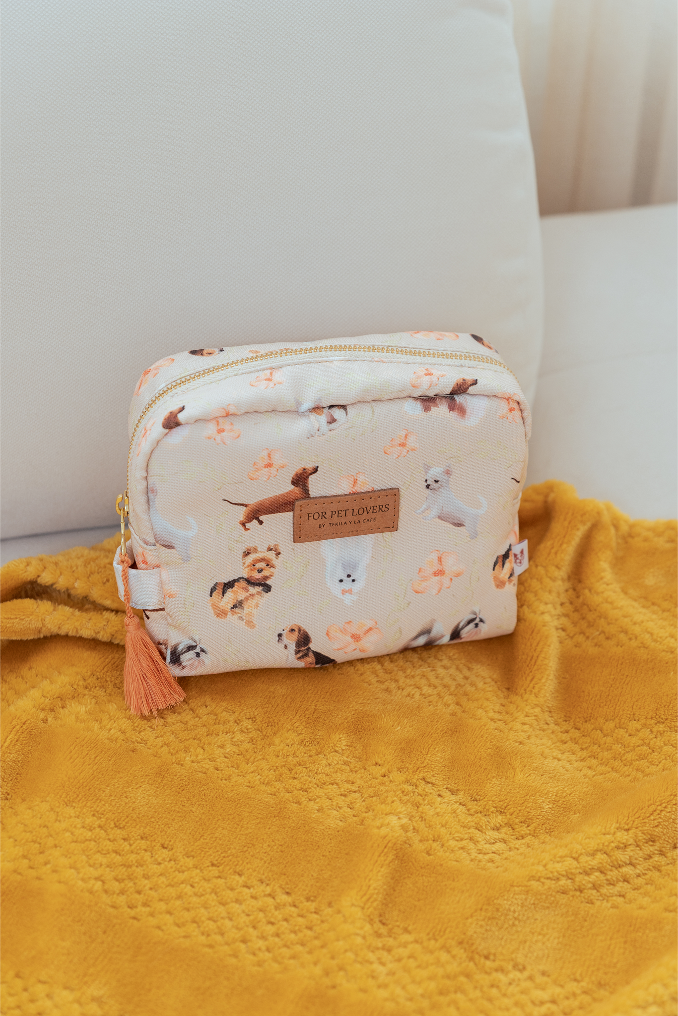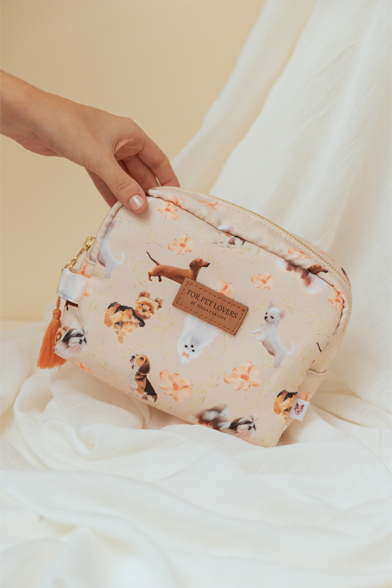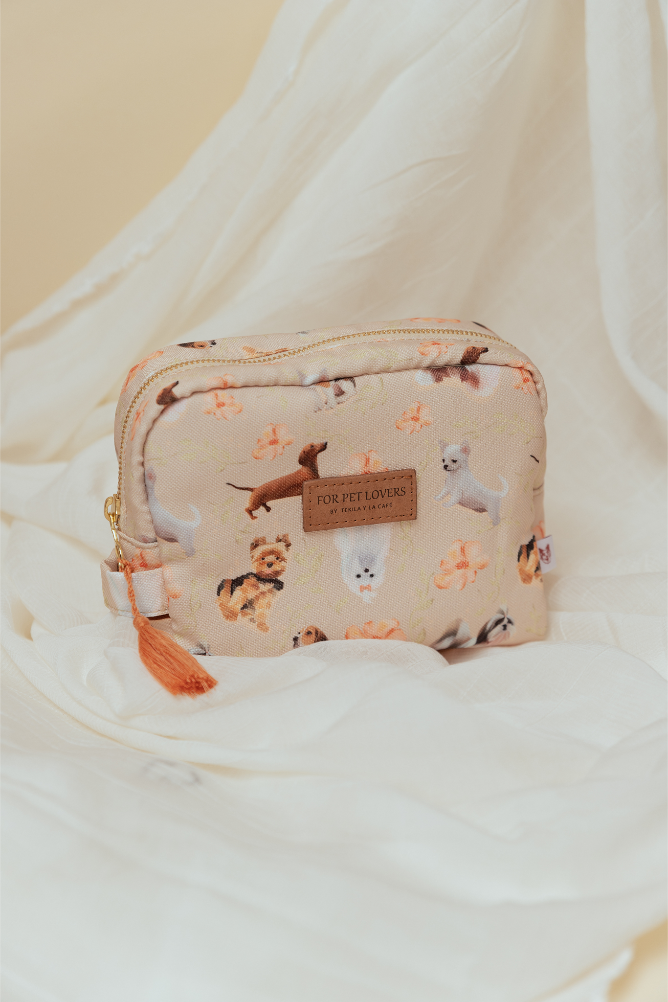 Bedruckte Kosmetiktasche mit einem innenfutter aus wasserabweisendem Stoff, goldfarbener Reißverschlussschließe und dekorativem Anhänger. Mit einem 100% Leder-Detail. Dieses Produkt ist handillustriert. Finde dein pelziges Liebling!
