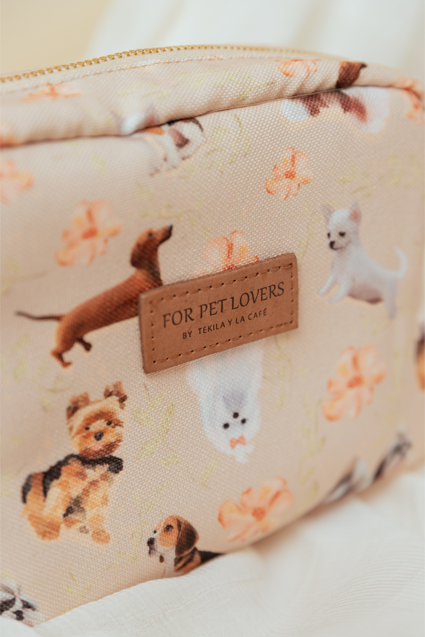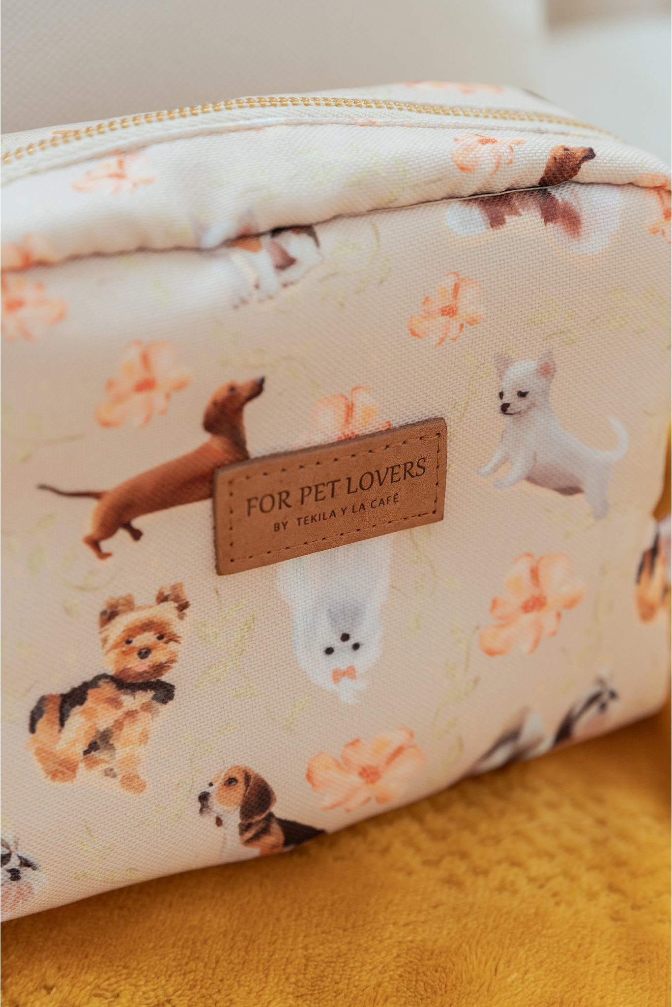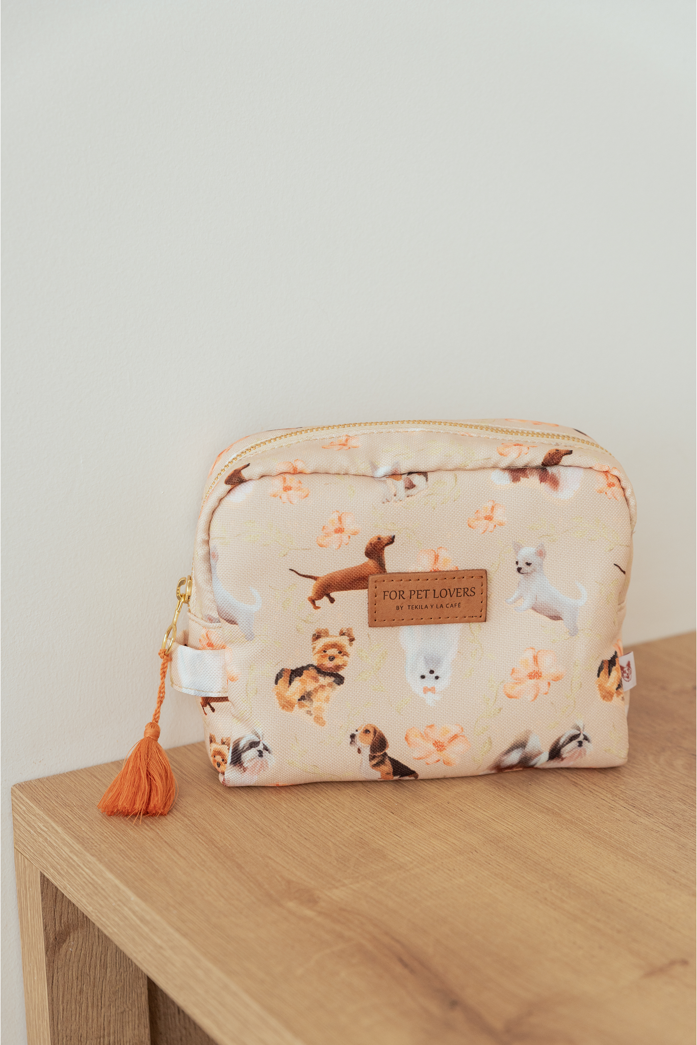 Bedruckte Kosmetiktasche mit einem innenfutter aus wasserabweisendem Stoff, goldfarbener Reißverschlussschließe und dekorativem Anhänger. Mit einem 100% Leder-Detail. Dieses Produkt ist handillustriert. Finde dein pelziges Liebling!
