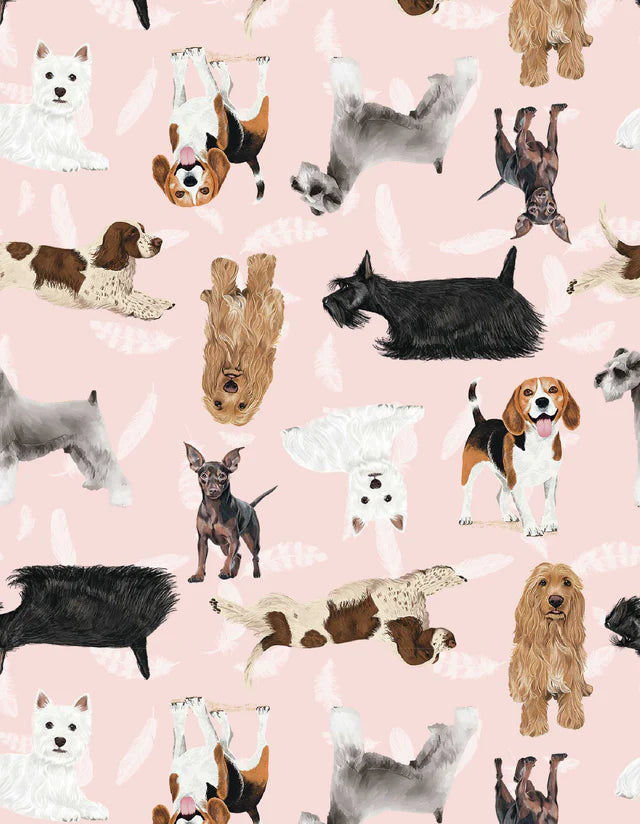 Schlafanzug für Damen mit kurzärmeliger Knopfhemdbluse und Shorts mit bequemer Passform, beide Teile bedruckt mit handgezeichneten Illustrationen von Hunden der folgenden Rassen: Scottish Terrier, Cocker, Springer Spaniel, Beagle, Westie, Schnauzer, Pinscher.