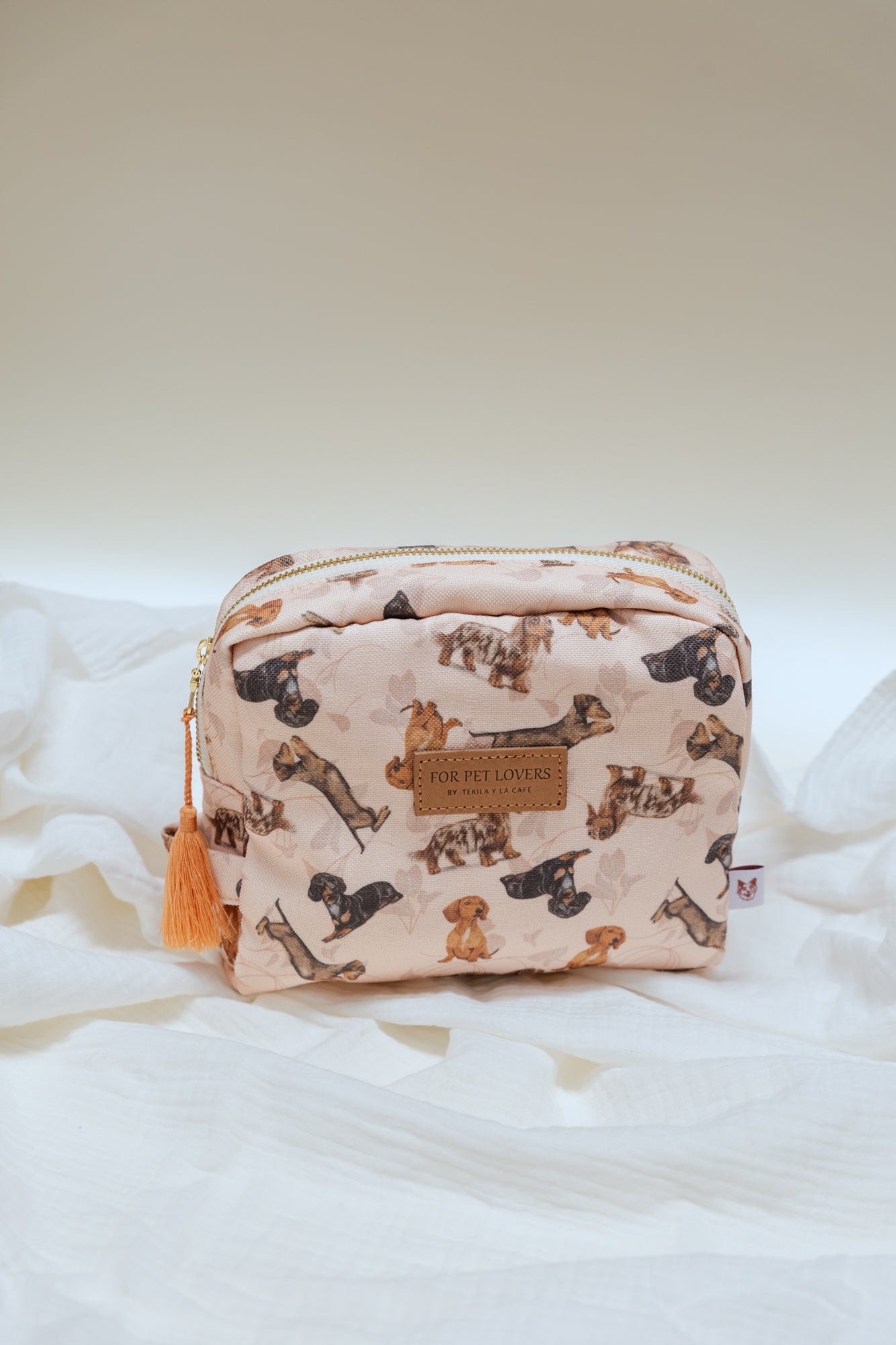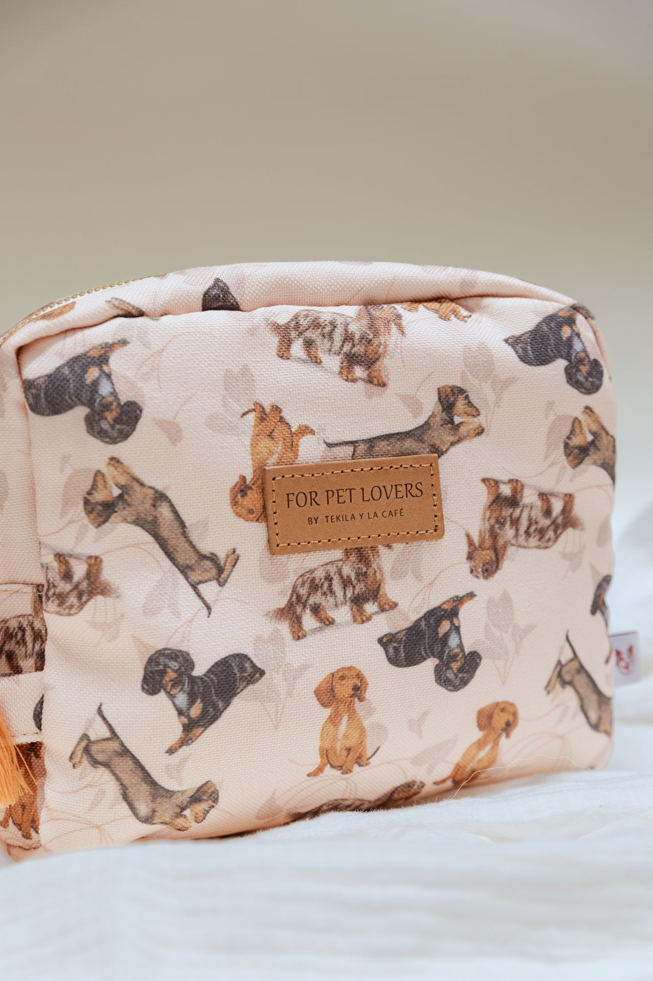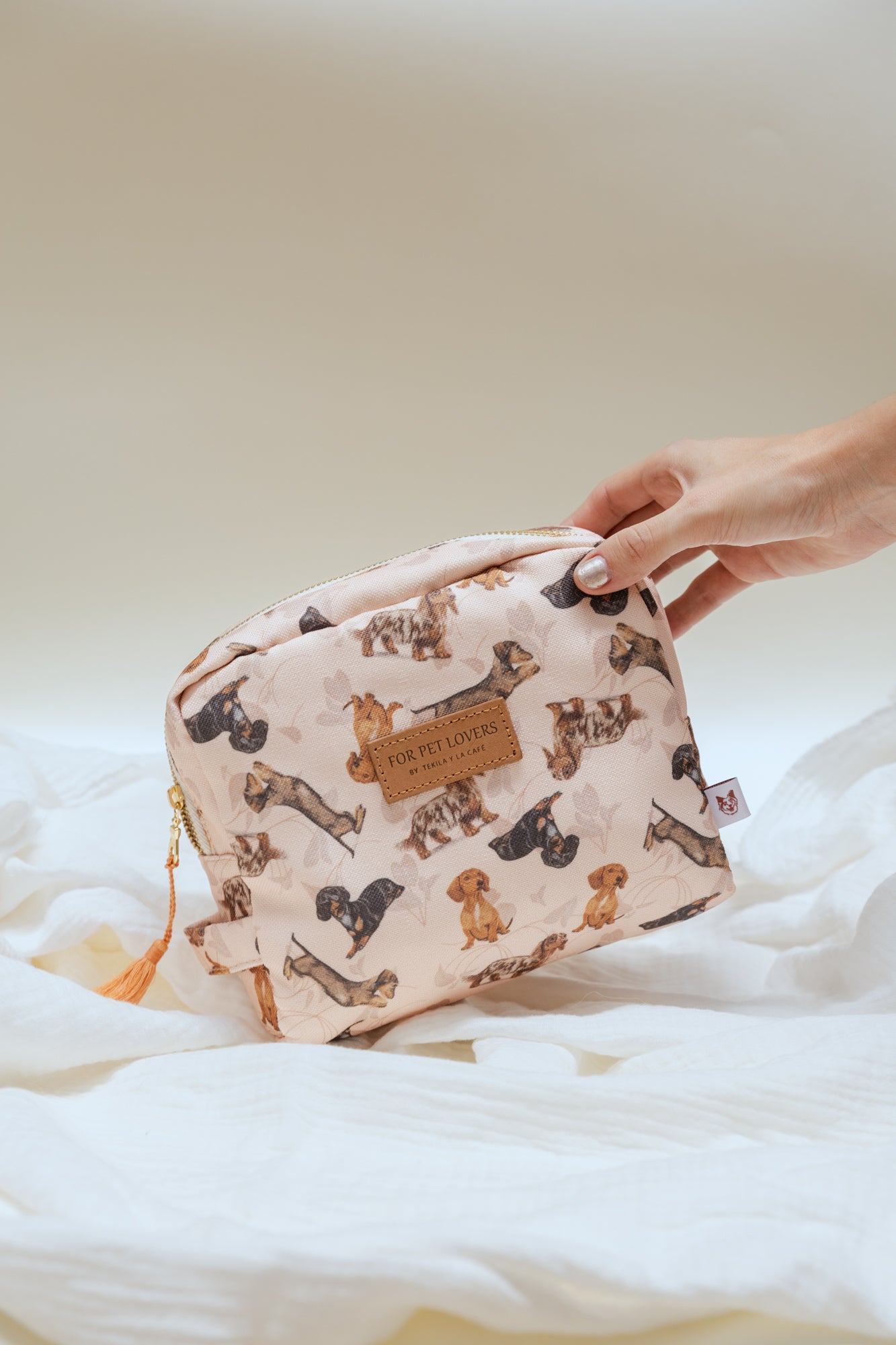 Bedruckte Kosmetiktasche mit einem innenfutter aus wasserabweisendem Stoff, goldfarbener Reißverschlussschließe und dekorativem Anhänger. Mit einem 100% Leder-Detail. Dieses Produkt ist handillustriert. Finde dein pelziges Liebling!
