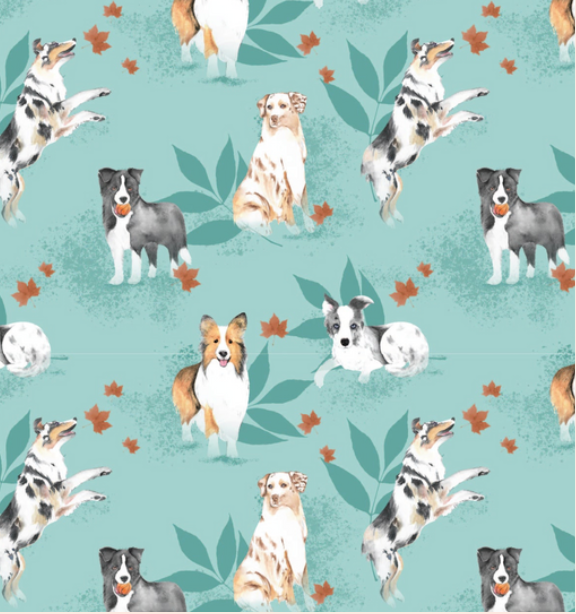 Damenpyjama mit Hose und langärmligem Hemd mit Knöpfen. Beide Teile sind mit handgezeichneten Illustrationen von Hütehunden bedruckt, darunter Border Collie, Australian Shepherd und Shetland Sheepdog.