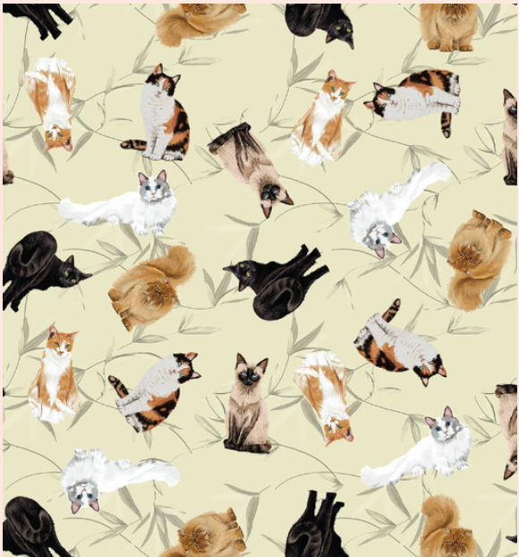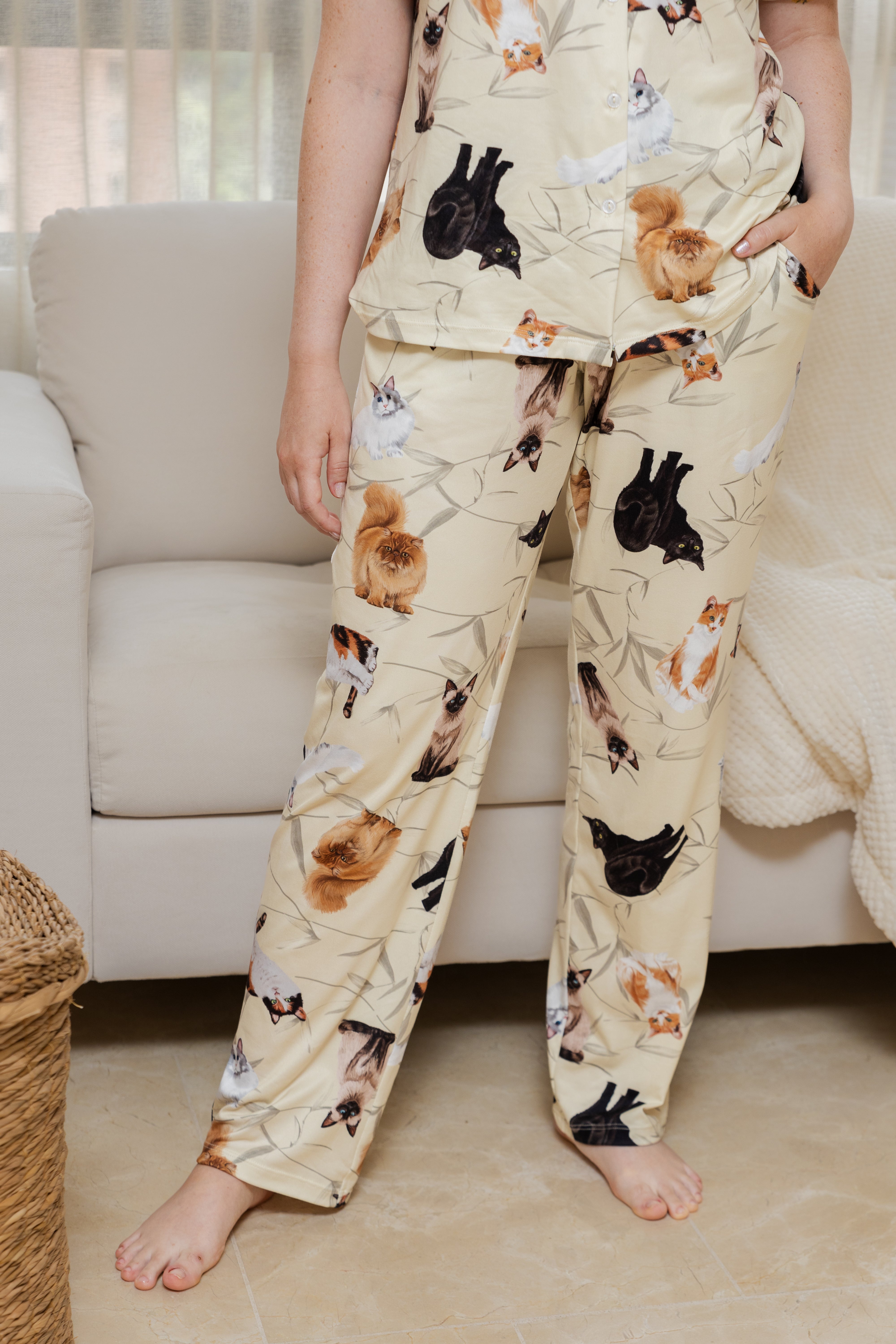 Damenpyjama mit langer Hose und kurzärmligem Hemd mit Knöpfen. Beide Teile sind mit handgezeichneten Illustrationen verschiedener Katzenrassen bedruckt: Perser, Siamkatze, Calico, Schwarze Katze und Weiße Katze.