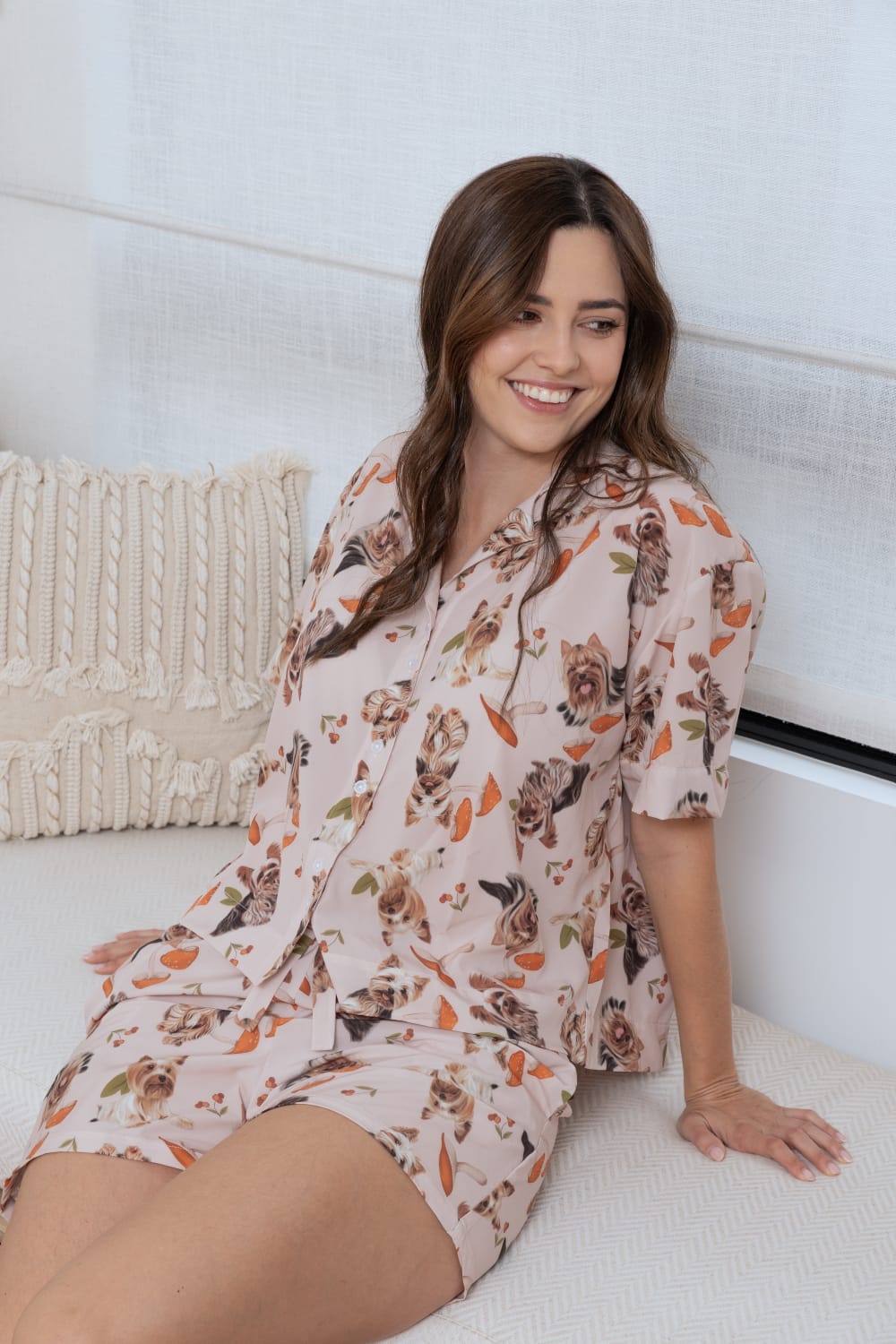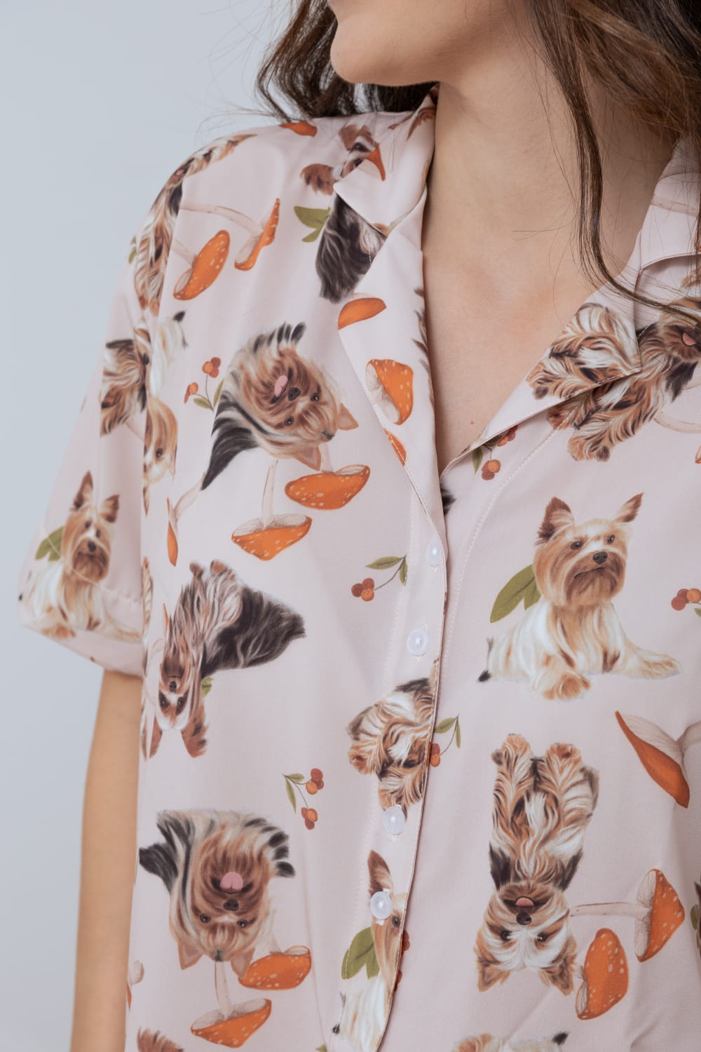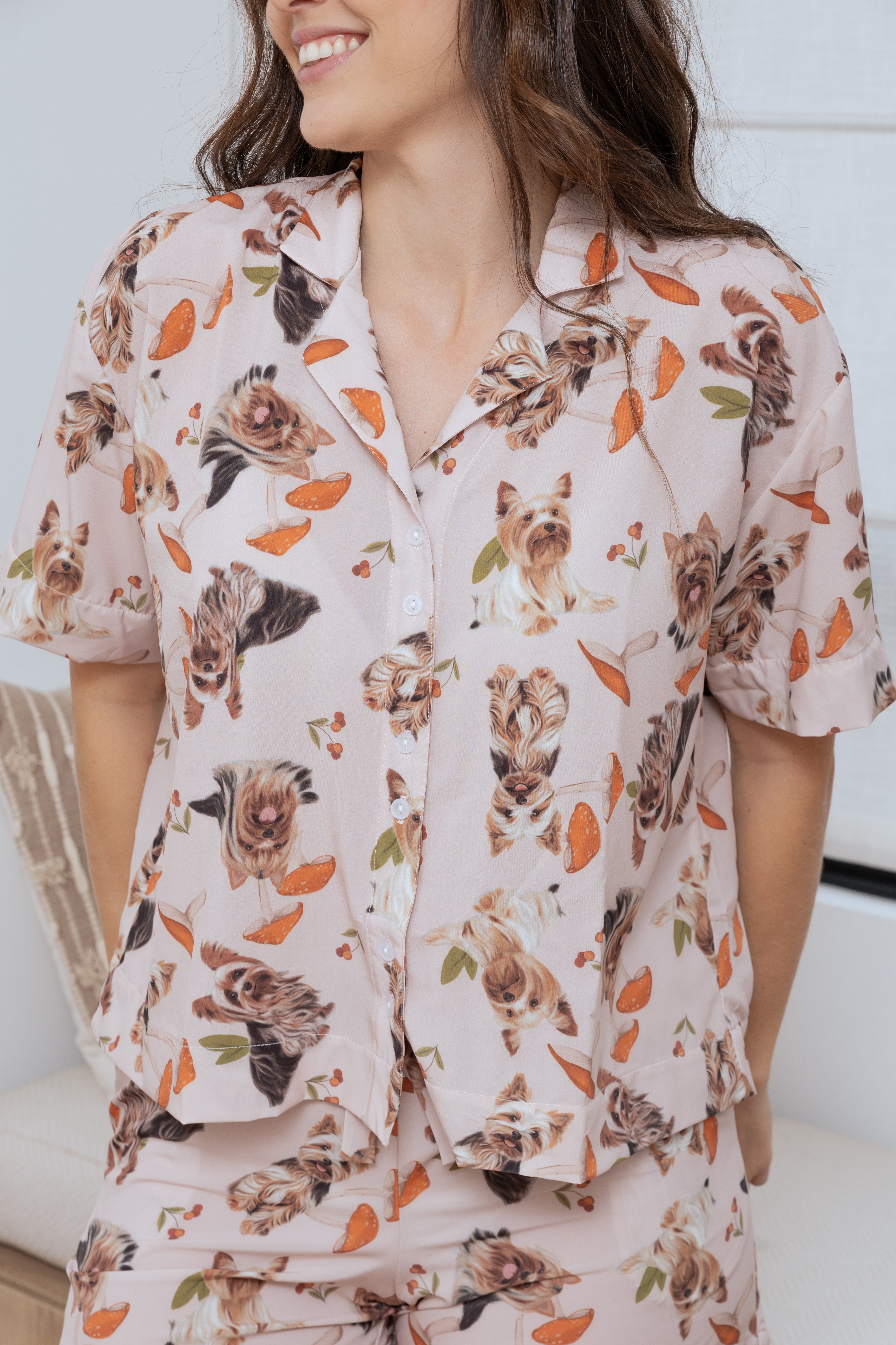 Schlafanzug für Damen mit kurzärmeligem Hemd mit Knopfleiste und bequemen Shorts, beide Kleidungsstücke mit handgezeichneten Illustrationen von Yorkie-Hunden bedruckt. Aus matter Satin-ähnlicher Stoffqualität, weich, luftig und bequem.